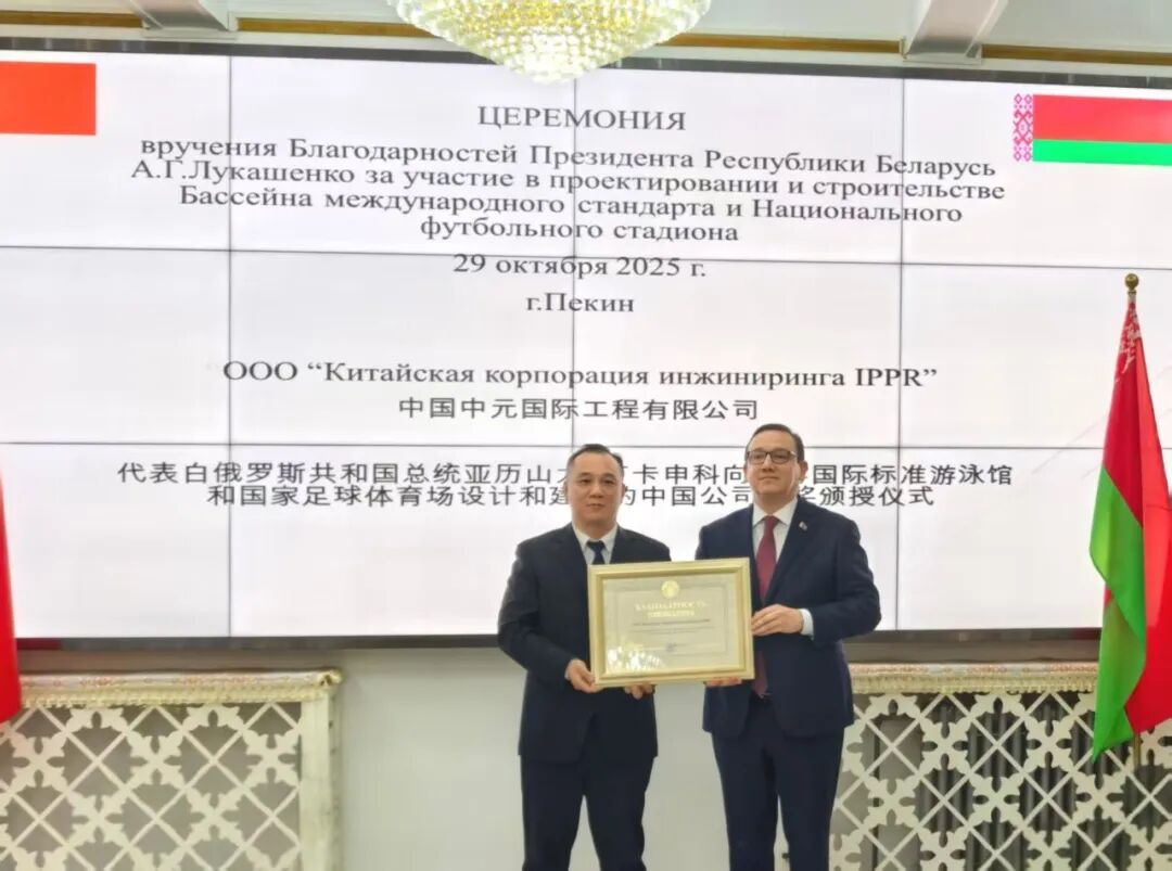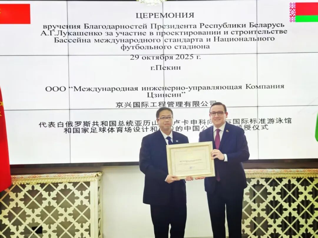 10月29日,白俄羅斯總統(tǒng)嘉獎(jiǎng)?lì)C授儀式在白駐華使館舉行。中國中元、所屬京興國際作為援白俄羅斯國家足球體育場(chǎng)項(xiàng)目的設(shè)計(jì)與項(xiàng)目管理單位,憑借卓越的工程設(shè)計(jì)與項(xiàng)目管理能力,榮獲盧卡申科總統(tǒng)簽字簽署的嘉獎(jiǎng)令。白俄羅斯總統(tǒng)辦公廳第一副主任弗拉基米爾·鮑里索維奇·佩爾采夫、駐華大使亞歷山大·維克托羅維奇·切爾維亞科夫共同為獲獎(jiǎng)單位頒發(fā)榮譽(yù)。