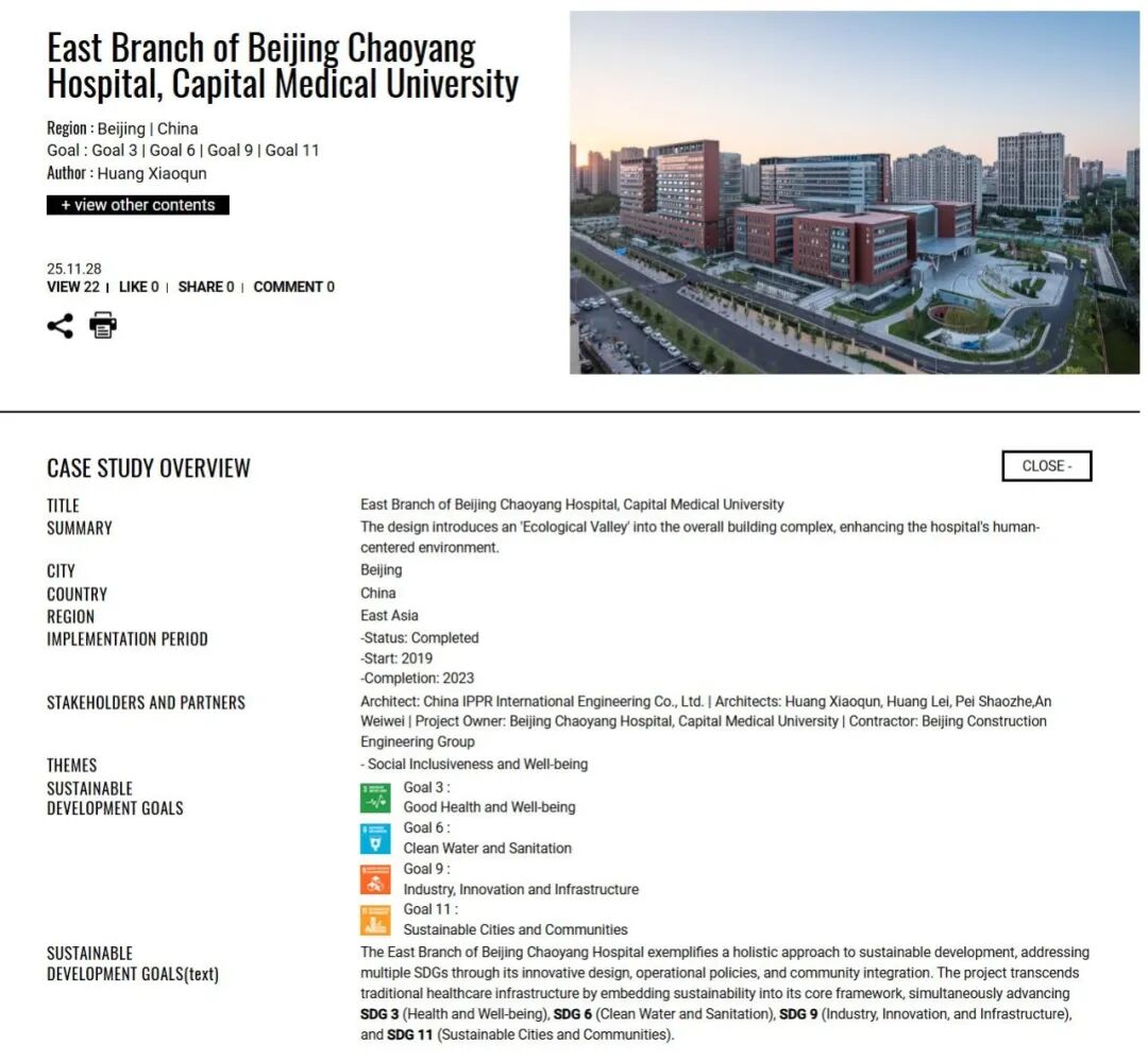近日,由中國中元設(shè)計的首都醫(yī)科大學(xué)附屬北京朝陽醫(yī)院東院建設(shè)工程(以下簡稱“項目”)成功入選2025年度聯(lián)合國"亞太城市可持續(xù)發(fā)展目標優(yōu)秀項目庫",并榮獲認可獎。