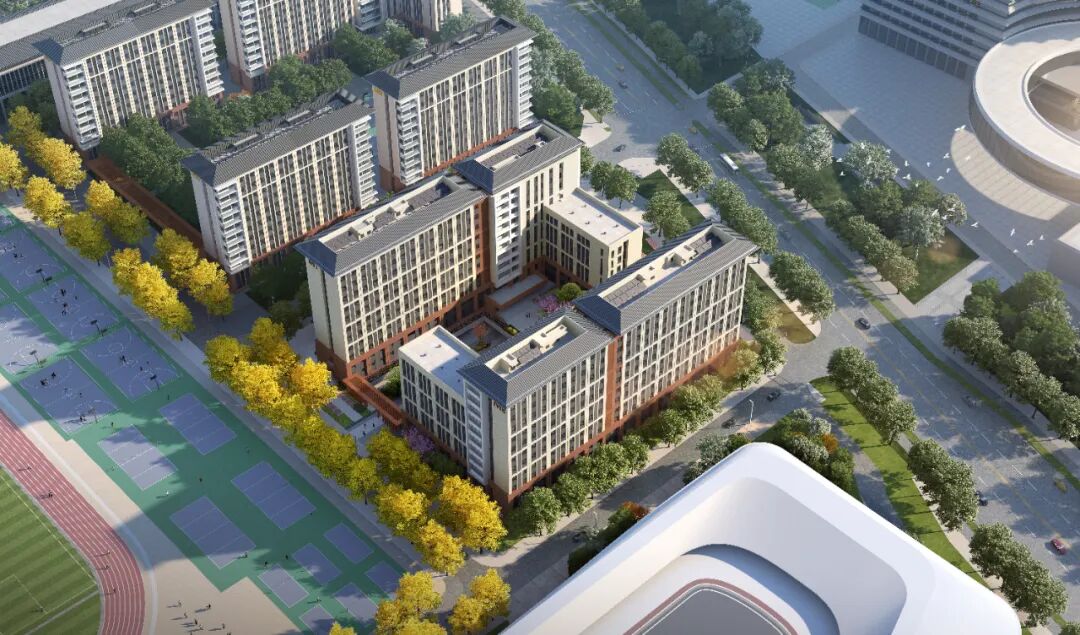 第一組團項目總建筑面積約14萬平方米,包含學生宿舍、一站式服務社區(qū)、學生生活服務區(qū)等功能。設計遵循“世界眼光、國際標準、中國特色、高點定位”理念,以“中華風范、淀泊風光、創(chuàng)新風尚”為指導原則,彰顯規(guī)整端莊的空間形制,又緊扣人與地球家園和諧共生的地學文化內涵??傮w建筑風貌以“中西合璧、以中為主、古今交融”為控制原則,構建傳統(tǒng)與現(xiàn)代、守正與創(chuàng)新交相輝映,具有地學特色的國際化新型校園。